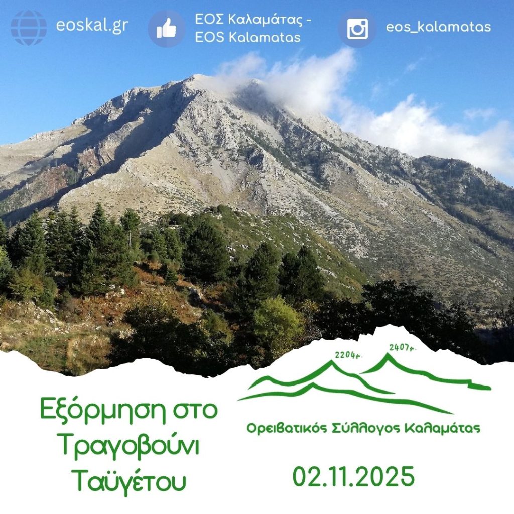 Ο Ορειβατικός Σύλλογος Καλαμάτας την Κυριακή 2 Νοεμβρίου 2025 θα πραγματοποιήσει ανάβαση στο Τραγοβούνι, μία από τις πιο όμορφες αλλά και δυσπρόσιτες κορυφές του Ταϋγέτου, που περιβάλλεται, στις περισσότερες πλευρές […]